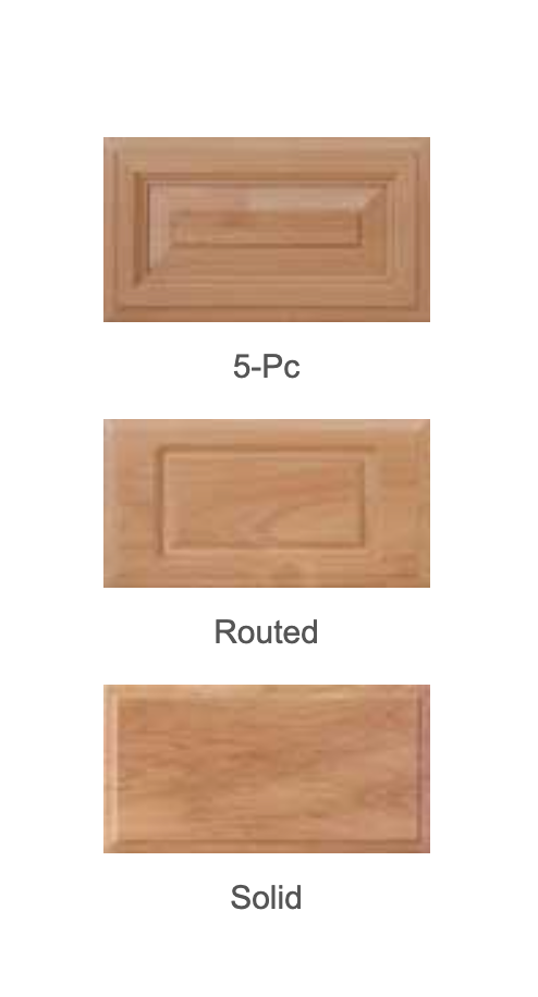 - 5-Piece and Routed & Solid Fronts shown in Alder Select with a clear finish.
