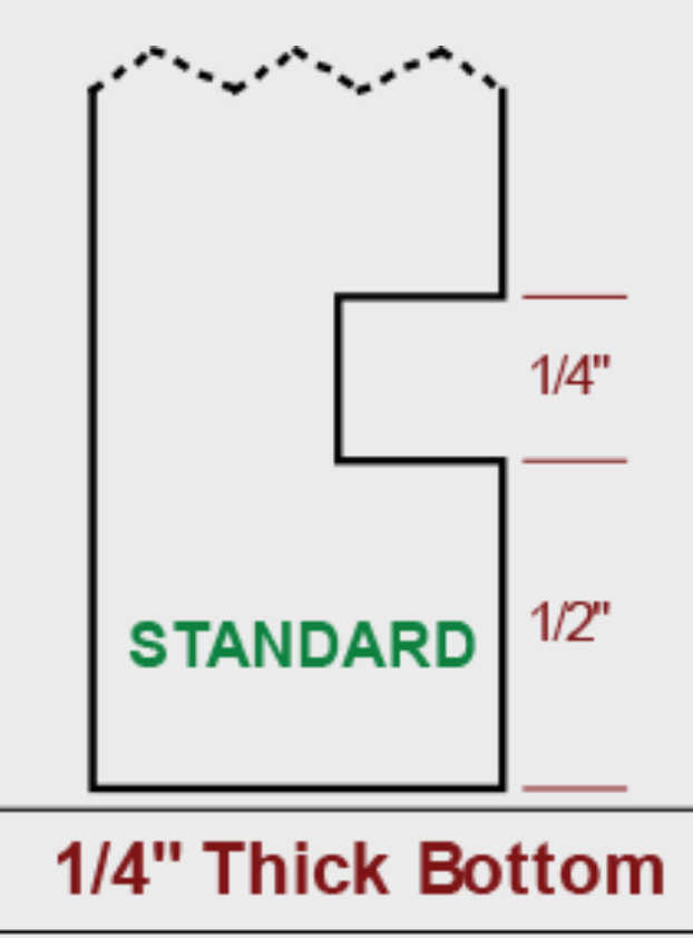 - The 1/4" thick Bottoms are placed 1/2" up from the bottom of the sides to allow for tandem undermount glides. Example shown in images.