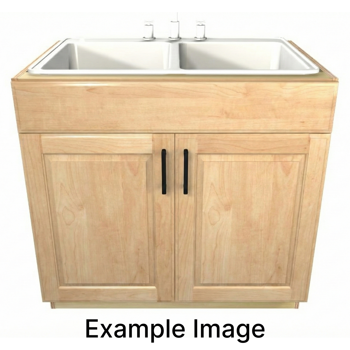 This ready-to-assemble sink base cabinet features two doors and one false front, engineered to house your sink fixture. The cabinet body utilizes 3/4" Purebond plywood with real maple veneer interior, finished in clear UV coating for durability and a natural appearance. Doors and cabinet face arrive unfinished raw wood, allowing customization with optional finishes. Dovetailed drawer boxes are pre-assembled and sealed with conversion varnish for lasting performance. Assembly is straightforward with visible construction holes on the sides post-assembly. Finished end panels and toe skins are sold separately to complete the installation. Verify your sink dimensions against cabinet specifications before ordering to ensure proper fit.